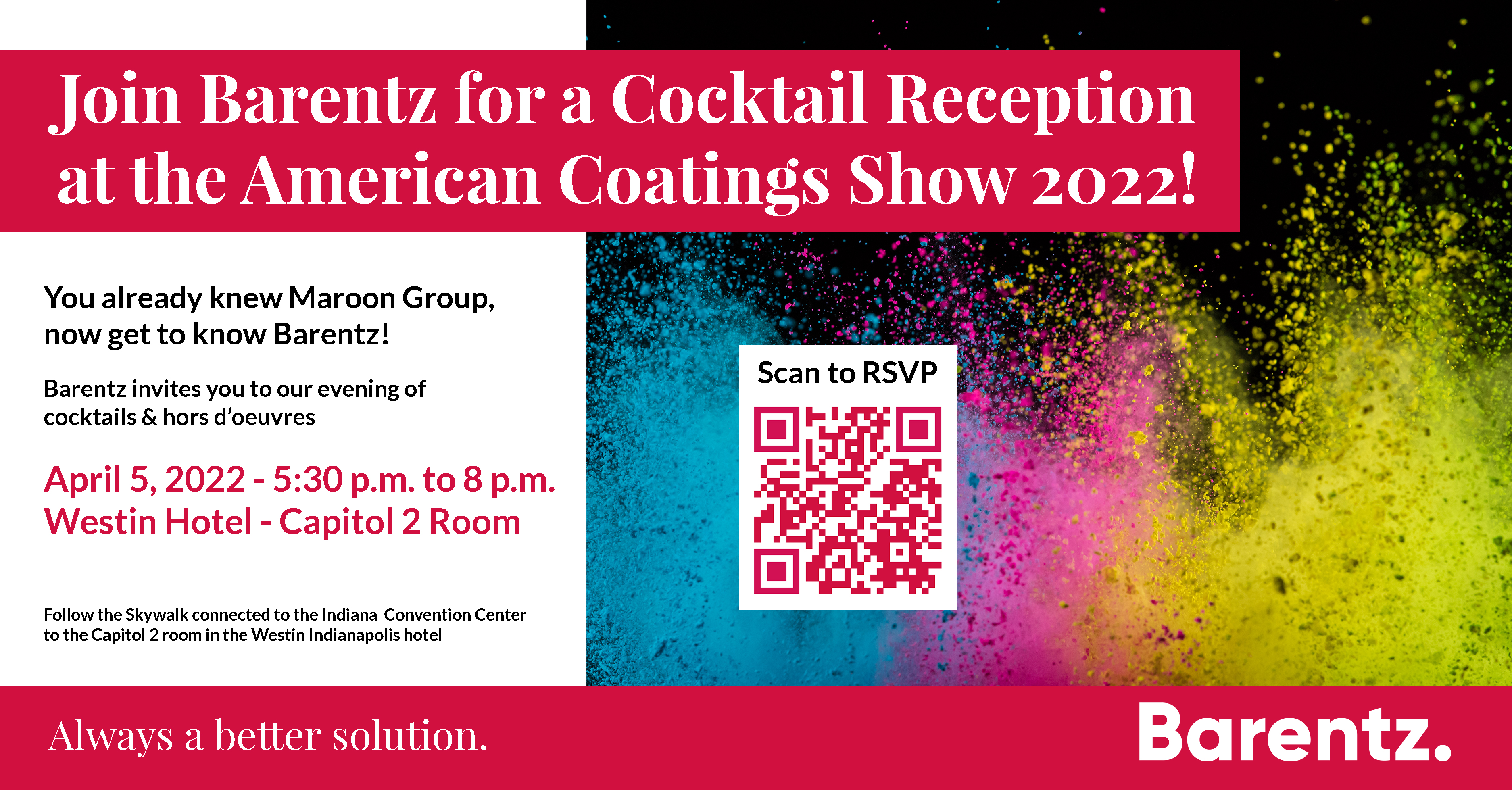 We want to invite you to relax and unwind at the American Coatings Show at our reception on April 5, 2022 from 5:30 p.m. to 8 p.m.