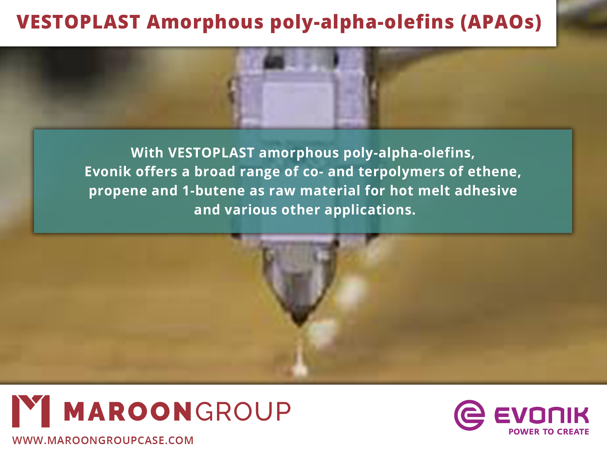 VESTOPLAST is a valuable ingredient for a broad range of applications and is one of the major resins used for hot melt adhesives. Typical hot melt applications are wood working, hygiene, packaging, automotive, and textiles. Other applications include bitumen modification, wire & cable, sealants, and mattress construction. Contact your Maroon Group Account Manager to learn more about Vestoplast. Samples are available. Call or email us today at 440-937-1000 or marketing@maroongroupllc.com.