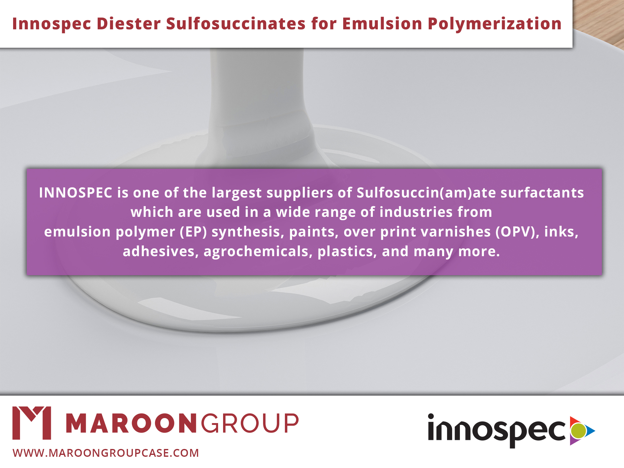 Explore the full Innospec range of Diester Sulfosuccinates as well as their Monoester Sulfosuccinates and Sulfosuccinamates. Contact your Maroon Group Account Manager or visit www.maroongroupllc.com to learn more about the full of Innospec surfactants for Emulsion Polymerization. Samples are available now. Call or email us today at 440-937-1000 or marketing@maroongroupllc.com.