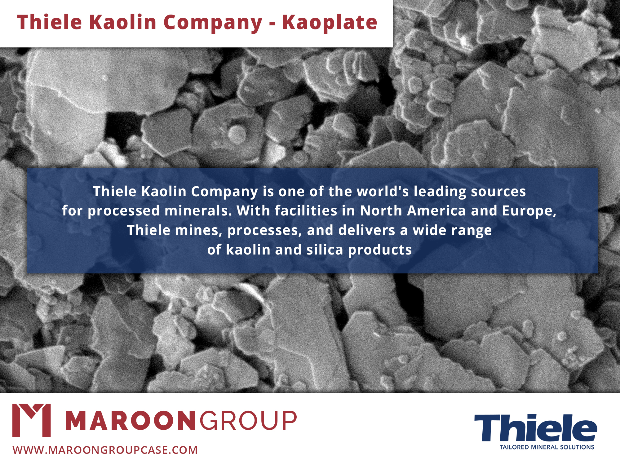 To learn more about the wide range of products from Thiele Kaolin Company, contact your Maroon Group Account Manager today! Samples are available. Call or email us today at 440-937-1000 or marketing@maroongroupllc.com.